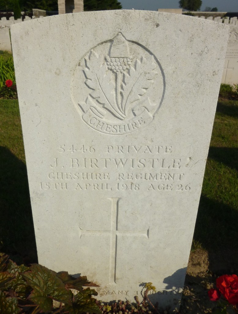 15/04/1918 Private John Birtwistle (Age 26) 2nd/7th Bn. La Targette British Cemetery, Neuville-St. Vaast, Pas de Calais France. ‘5446’ I. J. 20. Husband of Polly Birtwistle, of 7, Kenyon St., Freetown, Bury, Lancs. (pic findagrave.com – with thanks)