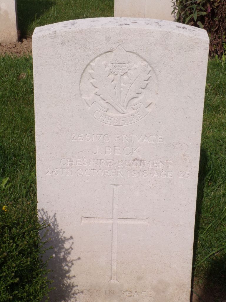 26/10/1918 Private John Beck (Age 25) 1st/6th Bn. Pont-De-Nieppe Communal Cemetery, Nord France. ‘265170’ Husband of Annie Beck, of 62, Travis St., Hyde, Cheshire. (pic from findagrave.com – with thanks)