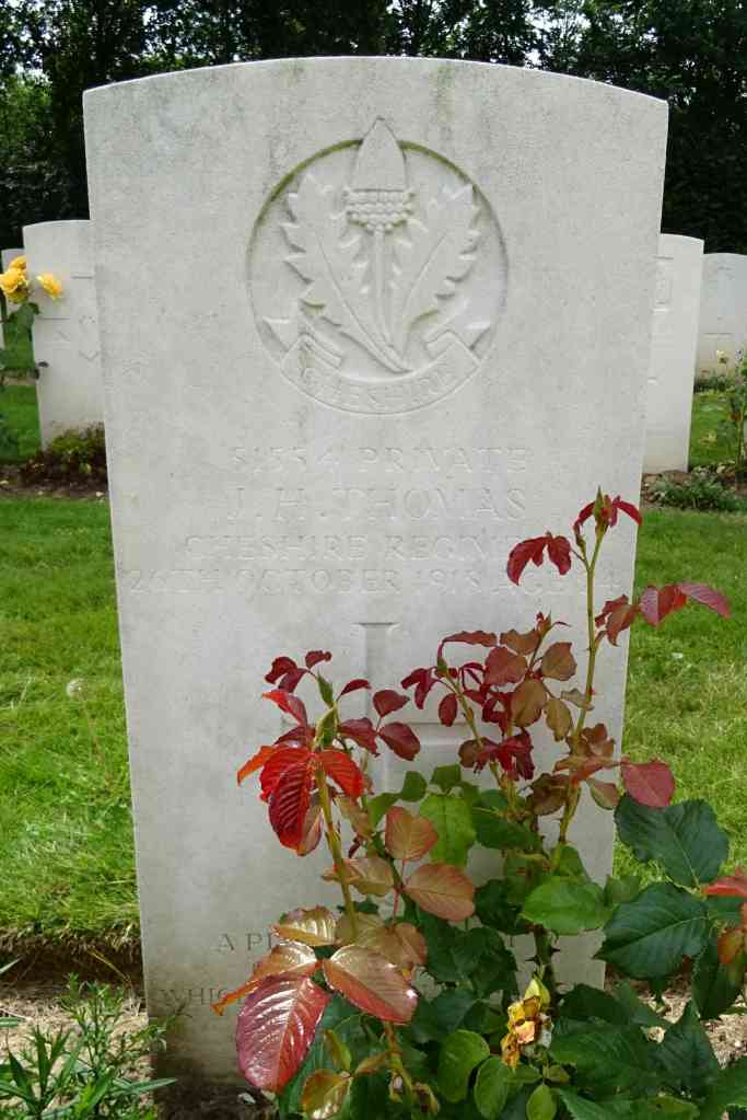 26/10/1918 Private Joseph Henry Thomas (Age 24) 1st Bn. Awoingt British Cemetery, Nord France. ‘51554’ Only son of John James and Mary Thomas, of Clay Lanes, Elton, Sandbach, Cheshire. (pic from findagrave.com – with thanks)