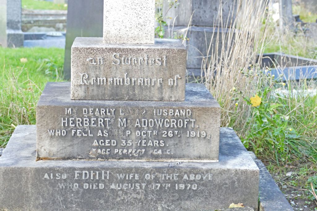 26/10/1919 Serjeant Herbert Meadowcroft (Age 35) 2nd/5th Bn. Hale Cemetery, Cheshire United Kingdom. ‘63747’ Husband of Edith Meadowcroft, of 4, Woodlands Bank, Stockport Rd., Timperley, Altrincham. (pic from findagrave.com – with thanks)